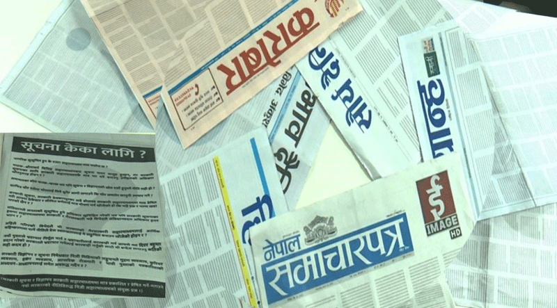 काठमाडाैं - सरकारी सूचना र विज्ञापन सरकारी सञ्चारमाध्यममा मात्रै दिने सरकारको नीतिविरूद्ध निजी सञ्चारमाध्यमले विरोध गरेका छन् । निजी पत्रिकाहरुले पहिलो पृष्ठमा सूचना केका लागि भन्दै प्रश्नवाचक चिन्ह मात्रै राखेर साेमबार निजी सञ्चारमाध्यमले प्रकाशित गरेका छन् ।
