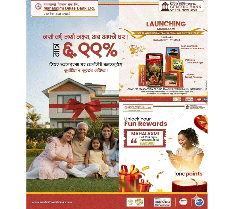 विभिन्न योजनाहरु अन्तर्गत वर्ष २०८३ लाई डिजिटल प्रवद्र्धन वर्षको रुपमा मनाउने बैकको योजना अनुरुप महालक्ष्मी विकास बैंकको मोबाइल एप “महालक्ष्मी स्मार्ट साथी” मार्फत बैकका सबै सक्रिय मोबाइल बैकिङ प्रयोगकर्ताहरुले आफ्नो मोबाइल बैकिङ प्लेटफर्म माफर्त बैशाख महिनाको पहिलो हप्तामा कम्तीमा एक सफल कारोबार गरेको अवस्थामा गोलाप्रथा मार्फत ३ जना प्रयोगकर्ताले आकर्षक भ्रमण प्याकेज जित्न सफल हुनेछन् ।