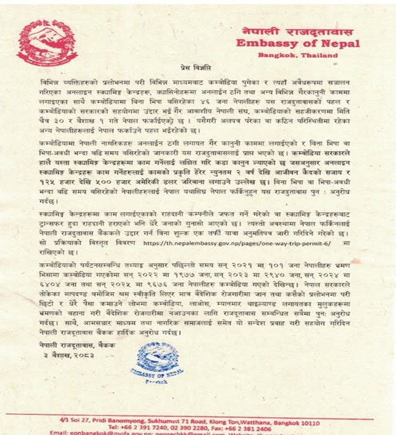 उक्त दूतावासका अनुसार आकर्षक रोजगारी पाइने विश्वासमा सन् २०२१ मा १०१, २०२२ मा एक हजार ९७७, सन् २०२३ मा दुई हजार ९४०, सन् २०२४ मा छ हजार ४०४ तथा सन् २०२५ मा नौ हजार ६७६ जना नेपाली कम्बोडिया पुगेका थिए ।