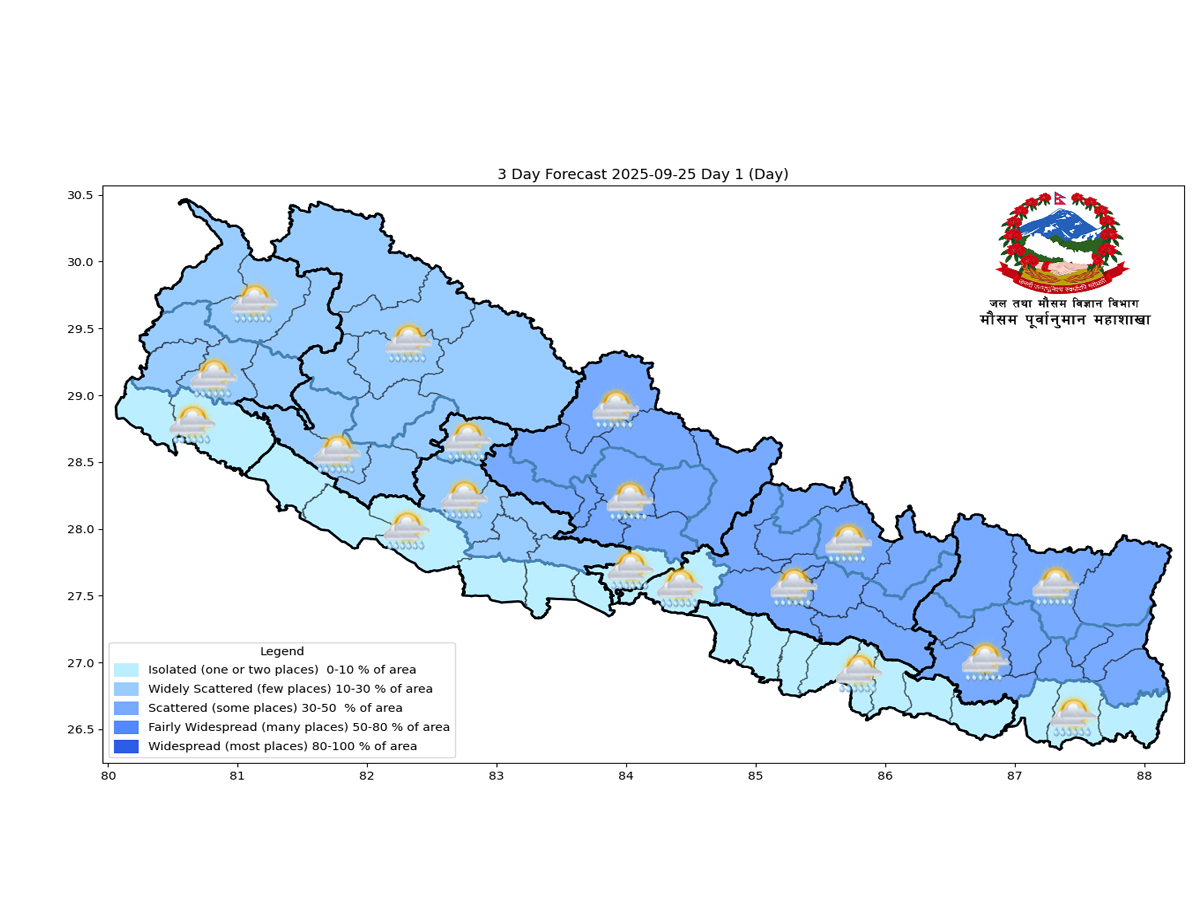 महाशाखाले आज मौसमसम्बन्धी विशेष बुलेटिन जारी गर्दै आज दिउँसो कोशी, बागमती, गण्डकी प्रदेशका पहाडी भू-भागका केही, लुम्बिनी र कर्णाली प्रदेशका पहाडी क्षेत्रका थोरै स्थानमा तथा बाँकी एक-दुई स्थानमा मेघगर्जनरचट्याङसहित मध्यम वर्षाको सम्भावना रहेको जनाएको छ । साथै कोशी र बागमती प्रदेशका पहाडी भू-भागका एक–दुई स्थानमा भारी वर्षाको पनि सम्भावना रहेको छ ।