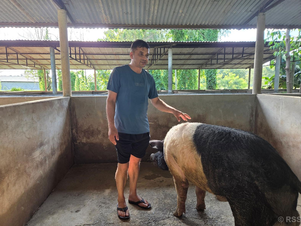 फार्ममा अहिले करिब ७० वटा सुँगुर बचेका छन् । बच्चा सुँगुरमध्ये ४० भन्दाबढी पानीमा डुबेर मरेका छन् भने मासु उत्पादनका लागि तयारी अवस्थामा रहेका सुँगुरहरू बाढीले बगाएर लगेको उनले बताए । उनले भने, “भारी वर्षापछि फार्ममा एक्कासी बाढी पस्यो, सुँगुरहरू आत्तिएर खोर नाघेर खोलातर्फ हामफाल्न थाले, हामी फार्मको पारीपट्टी थियौँ, उनीहरुलाई बचाउन सकिएन, फार्मको ढोका र झाडीमा अल्झिएर बचेका केही सुँगुर मात्र अहिले बाँकी छन् ।” उहाँले कुखुरा फार्म खोलाभन्दा केही पर भएकाले जोगिएको बताए । उक्त फार्ममा करिब ३० हजार कुखुरा छन् ।