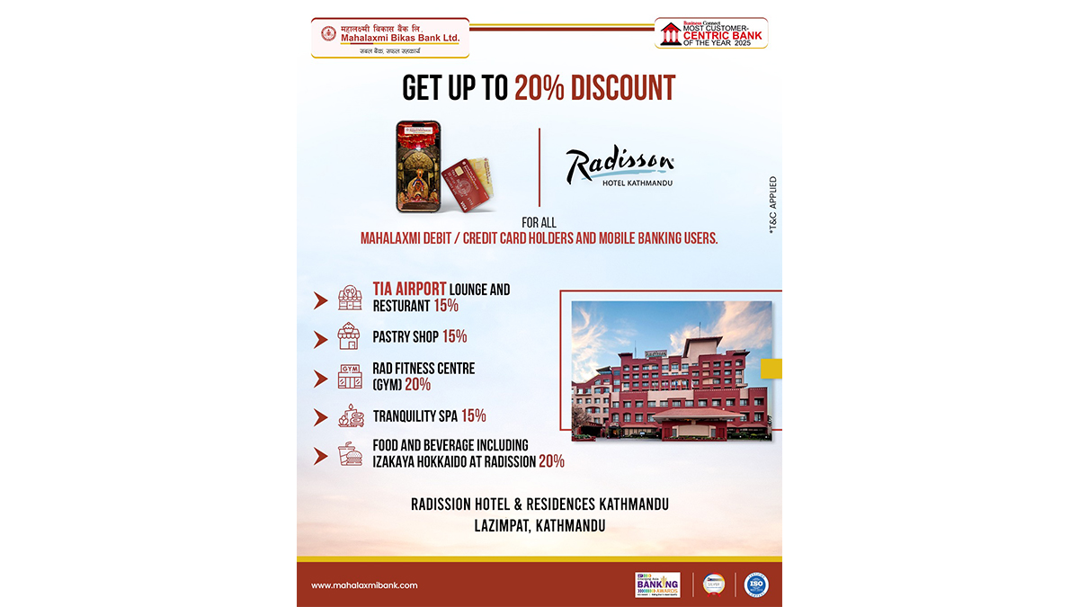 काठमाडाैं -महालक्ष्मी विकास बैंक लिमिटेडले ग्राहकहरुलाइ र्याडिसन एयरपोर्ट लाउन्जमा विशेष छुट दिने भएकाे छ ।