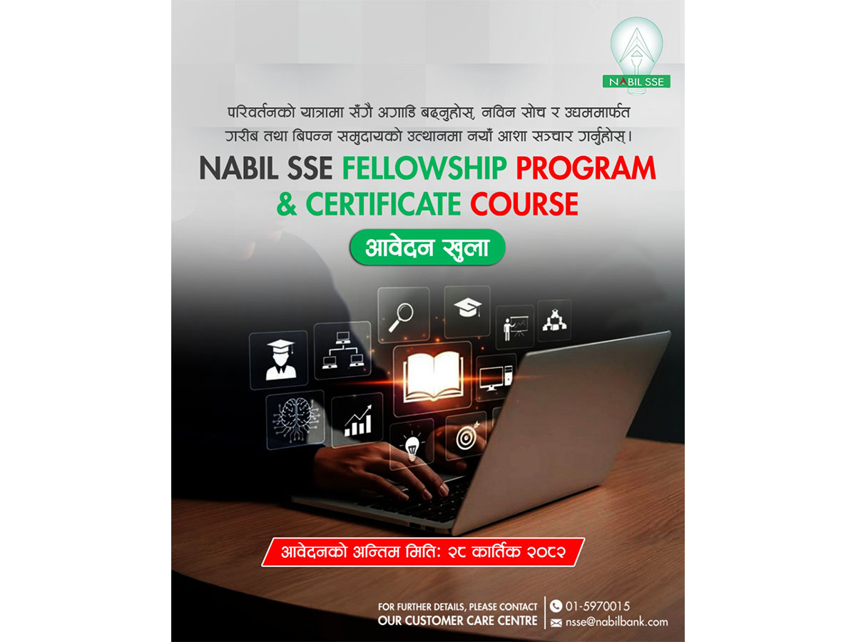 काठमाडौं - नबिल बैंक लिमिटेडले नबिल स्कूल अफ सोशल इन्टरप्रेनरसिप (नबिल एसएसई) अन्तर्गत फेलोसिप र सर्टिफिकेट कोर्सको नयाँ समूहका लागि आवेदन आह्वान गरेको छ । सामाजिक उद्यमशीलताको प्रवद्र्धन गर्न नबिल बैंकले नबिल स्कूल अफ सोशल इन्टरप्रेनरसिप (नबिल एसएसई) अन्तर्गत फेलोसिप र सर्टिफिकेट कोर्सको नयाँ समूहका लागि आवेदन आह्वान गरेको हाे ।