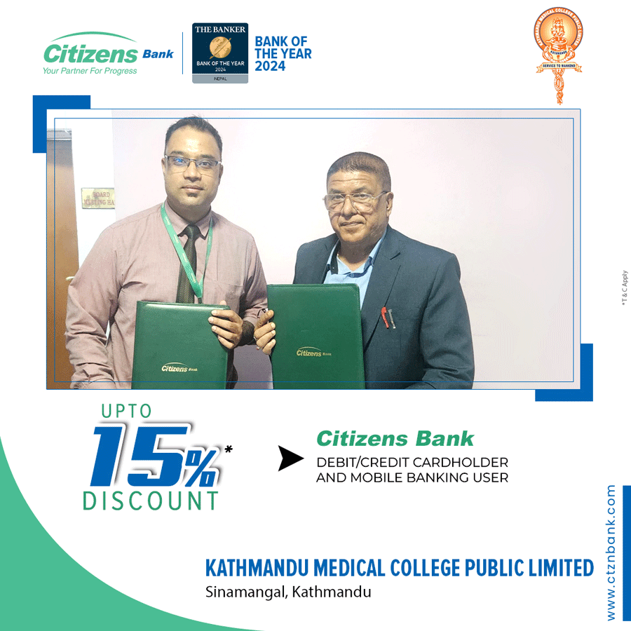 सो समझदारी पत्र अनुसार सिटिजन्स् बैंकका कार्डबाहक र मोबाइल बैंकिङ ग्राहकहरूले काठमाडांै मेडिकल कलेज प.ली मा १५% सम्मको आकर्षक छुट पाउनेछन् । यस किसिमको सहकार्यबाट बैंकका ग्राहकहरु लाभान्वित हुनुका साथै नगद कारोबारबाट डिजिटल कारोबार तर्फ उत्प्रेरित हुने विश्वास बैंकले लिएको छ ।