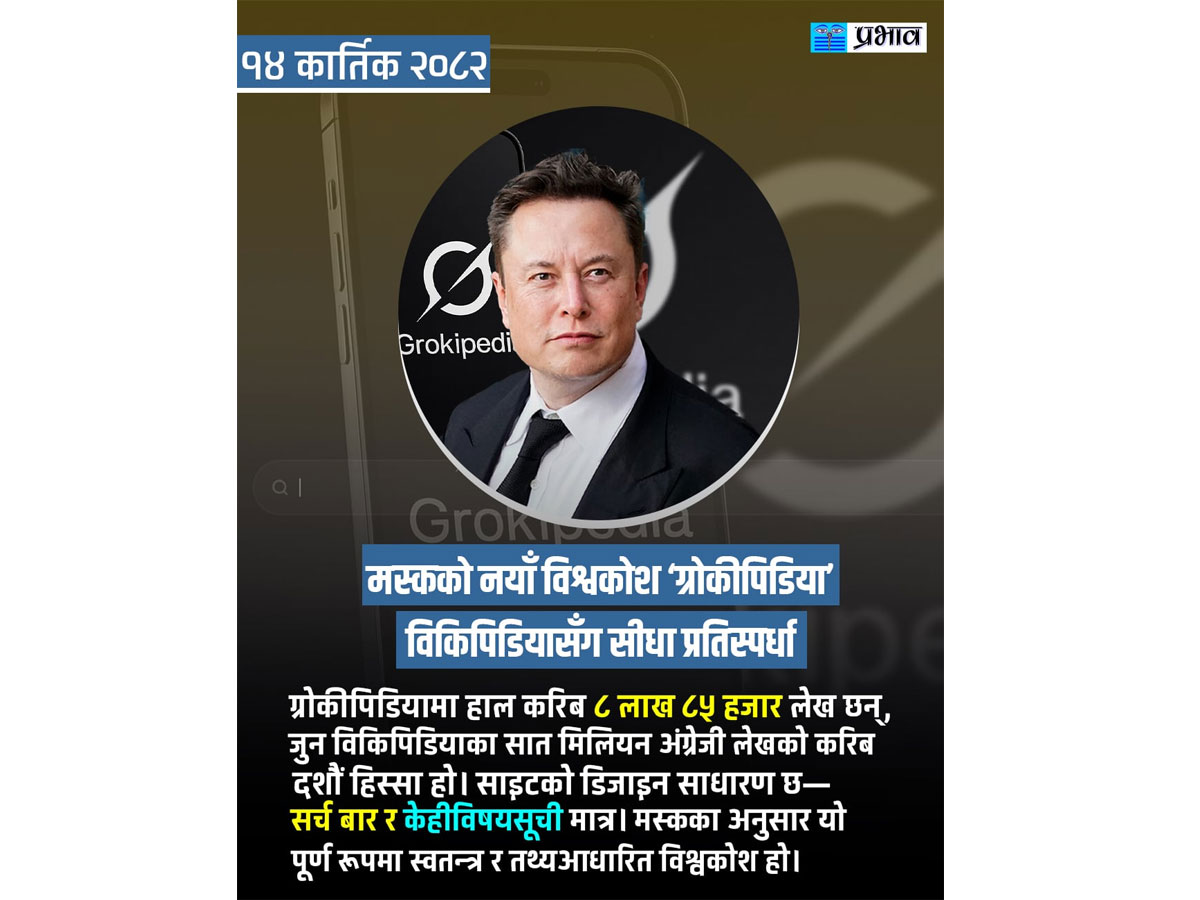 काठमाडौं - विकिपिडियालाई चुनौती दिन एलोन मस्कले ‘ग्रोकिपिडिया’ सार्वजनिक गरेका छन् । प्रख्यात उद्यमी एलोन मस्कले सोमबार आफ्नो कृत्रिम बुद्धिमत्ता कम्पनी xAI मार्फत नयाँ अनलाइन विश्वकोश ‘ग्रोकिपिडिया’ सार्वजनिक गरेका हुन्।