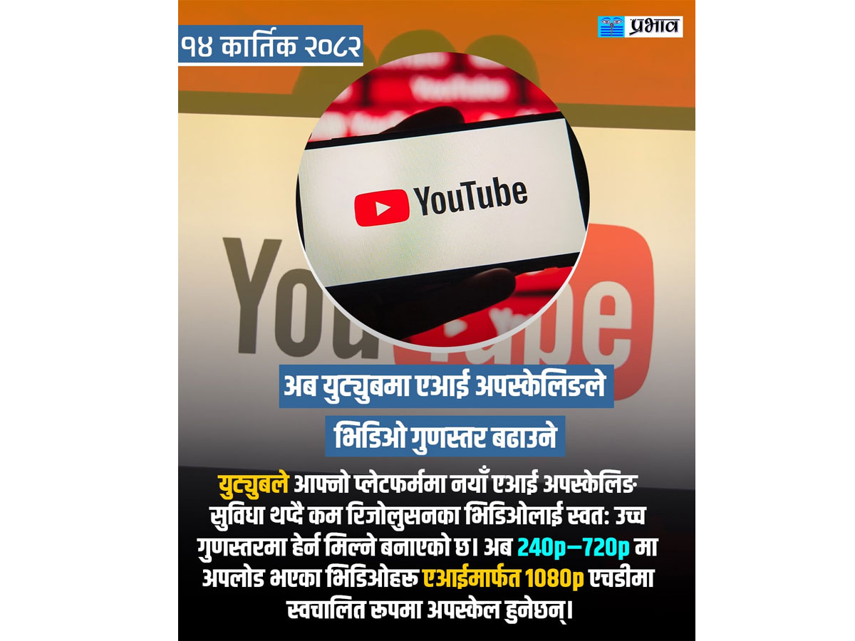 काठमाडौं -युट्युबमा अब कम-गुणस्तरका भिडिओ पनि एचडीमा हेर्न सकिने भएकाे छ ।  युट्युबले कम-रिजोलुसनका भिडिओहरूको गुणस्तर स्वचालित रूपमा बढाउने ‘एआई अपस्केलिङ’ सुविधा सार्वजनिक गरेको हाे ।