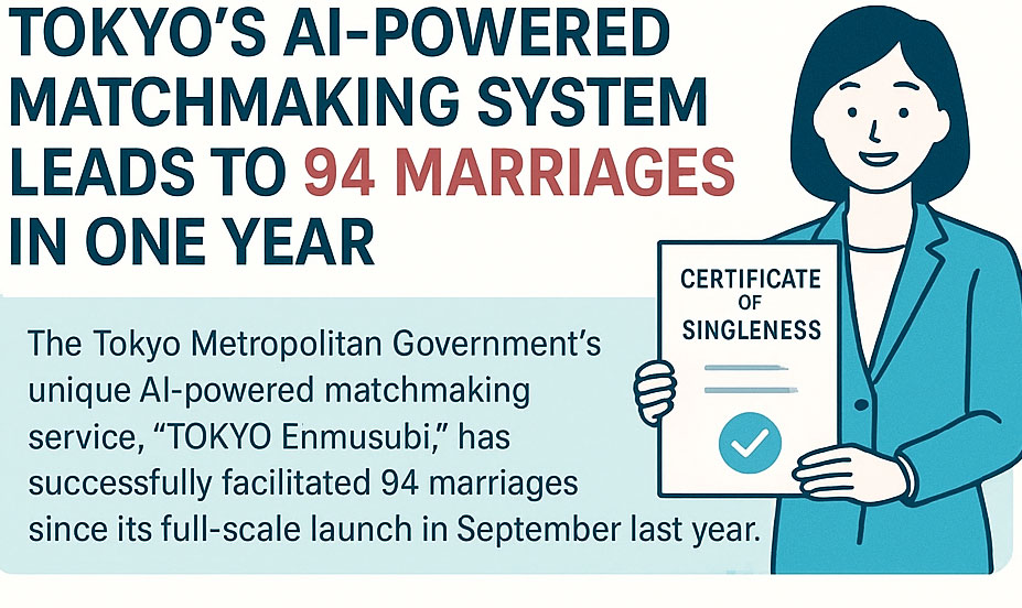 टोकियो - टोकियो सरकारले सञ्चालन गरेको एआई आधारित विवाह–परिचय सेवा “TOKYO Enmusubi ” ले विगत वर्ष सेप्टेम्बरमा पूर्ण रूपमा सञ्चालनमा आएपछि हालसम्म ९४ जोडीको विवाह सम्पन्न गराउन सफल भएको छ। जापानमा घट्दै गएको जन्मदर र युवाहरूको विवाहदर सुधार गर्ने उद्देश्यसहित यो पहल गभर्नर युरिको कोइकेको नेतृत्वमा अघि बढाइएको हो।