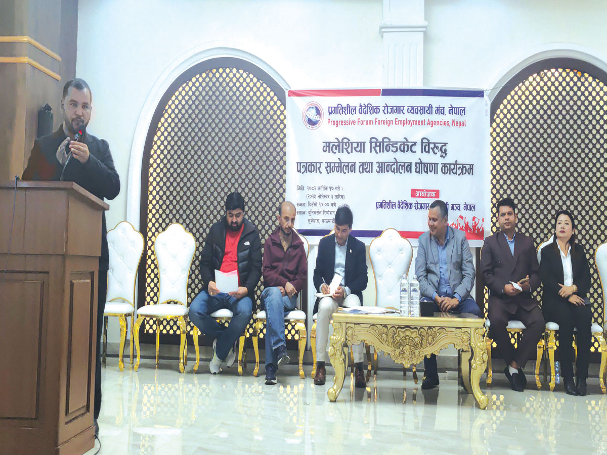 काठमाडौं– प्रगतिशील वैदेशिक रोजगार व्यवसायी मञ्च नेपालले मलेसिया ‘सिण्डिकेट’को न्यायोचित समाधान नभए चरणबद्ध आन्दोलनमा जाने घोषणा गरेको छ । सोमबार पत्रकार सम्मेलन गर्दै मञ्चले यस विषयमा नेपालको संविधान, श्रम ऐन र अन्तर्राष्ट्रिय मापदण्डलाई ख्याल गर्दै निर्णय गर्न सरकारलाई अनुरोध गरेको हो ।