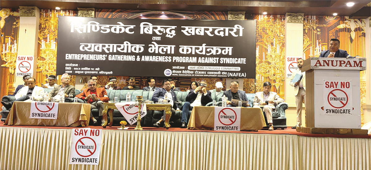 काठमाडौं– नेपाल वैदेशिक रोजगार व्यवसायी संघले सिण्डिकेडविरुद्ध खबरदारीसभा तथा व्यवसायी भेला सम्पन्न गरेको छ । मंगलबार बत्तीसपुतलीस्थित अनुपम फुडल्याण्डमा आयोजित कार्यक्रममा व्यवसायीहरुले ‘नो सिण्डिकेट’ लेखिएको कालो पट्टी बाँधेर सांकेतिक विरोध जनाएका छन् ।