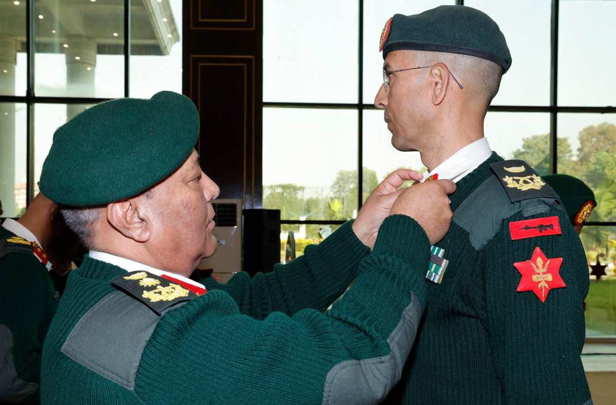 काठमाडौं– मन्त्रिपरिषद्को यही मङ्सिर ५ गतेको निर्णयअनुसार उपरथीमा विशेष बढुवा पाएका सहायक रथी कृष्णप्रसाद भण्डारीलाई प्रधान सेनापति अशोकराज सिग्देलले आज जंगी अड्डामा आयोजित एक कार्यक्रममा उपरथी दर्जाको दर्ज्यानी चिह्न प्रदान गरेका हुन् ।
