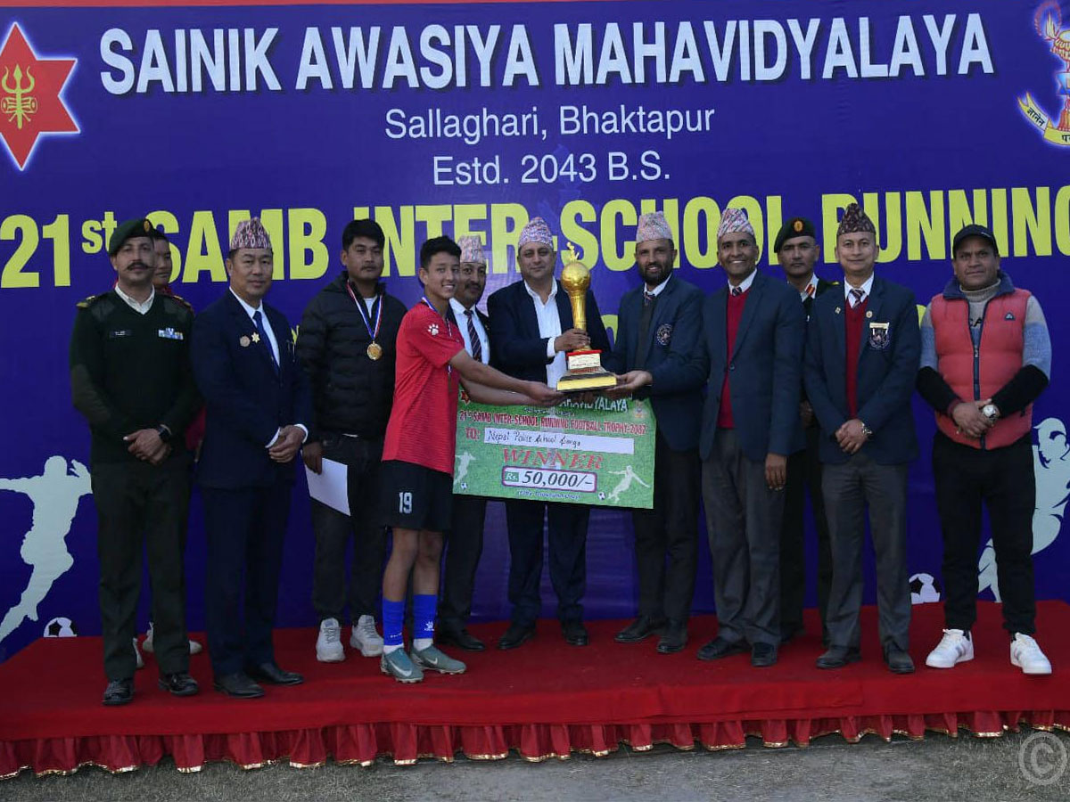 भक्तपुर- एक्काइसौँ सैनिक आवासीय महाविद्यालय अन्तर विद्यालय रनिङ फुटबल प्रतियोगितामा नेपाल पुलिस स्कूल विजेता भएको छ । भक्तपुरको सल्लाघारीस्थित सैनिक आवासीय महाविद्यालयले आयोजना गरेको उक्त प्रतियोगिताको आज सम्पन्न फाइनल खेलमा महाविद्यालयको टोली रातोलाई २–० गोलअन्तरले हराउँदै पुलिस स्कूल विजेता बनेको हो ।