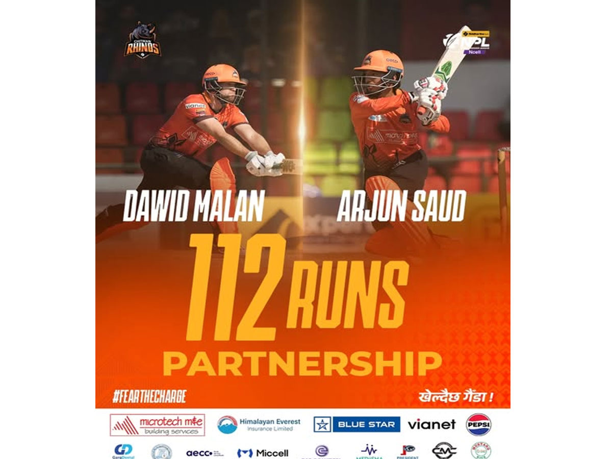 काठमाडौं - चितवन राइनोजका ओपनर ब्याटरद्वय डेविड मलान र अर्जुन साउदले अर्धशतक प्रहार गरेका छन् । कीर्तिपुर रङ्गशालामा जनकपुर बोल्ट्सविरुद्धको खेलमा दुवै खेलाडीले अर्धशतक प्रहार गरेका हुन् ।