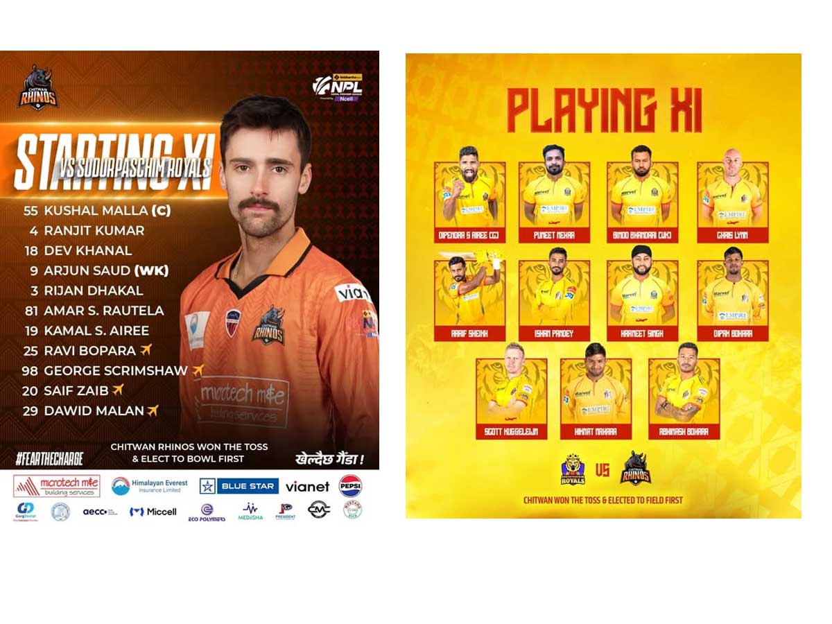 काठमाडाैं - राजधानीमा जारी दोस्रो संस्करणको नेपाल प्रिमियर लिग (एनपिएल) मा आजको दोस्रो खेलमा सुदूरपश्चिम रोयल्स र चितवन राइनोज प्रतिस्पर्धा गर्दैछन् ।