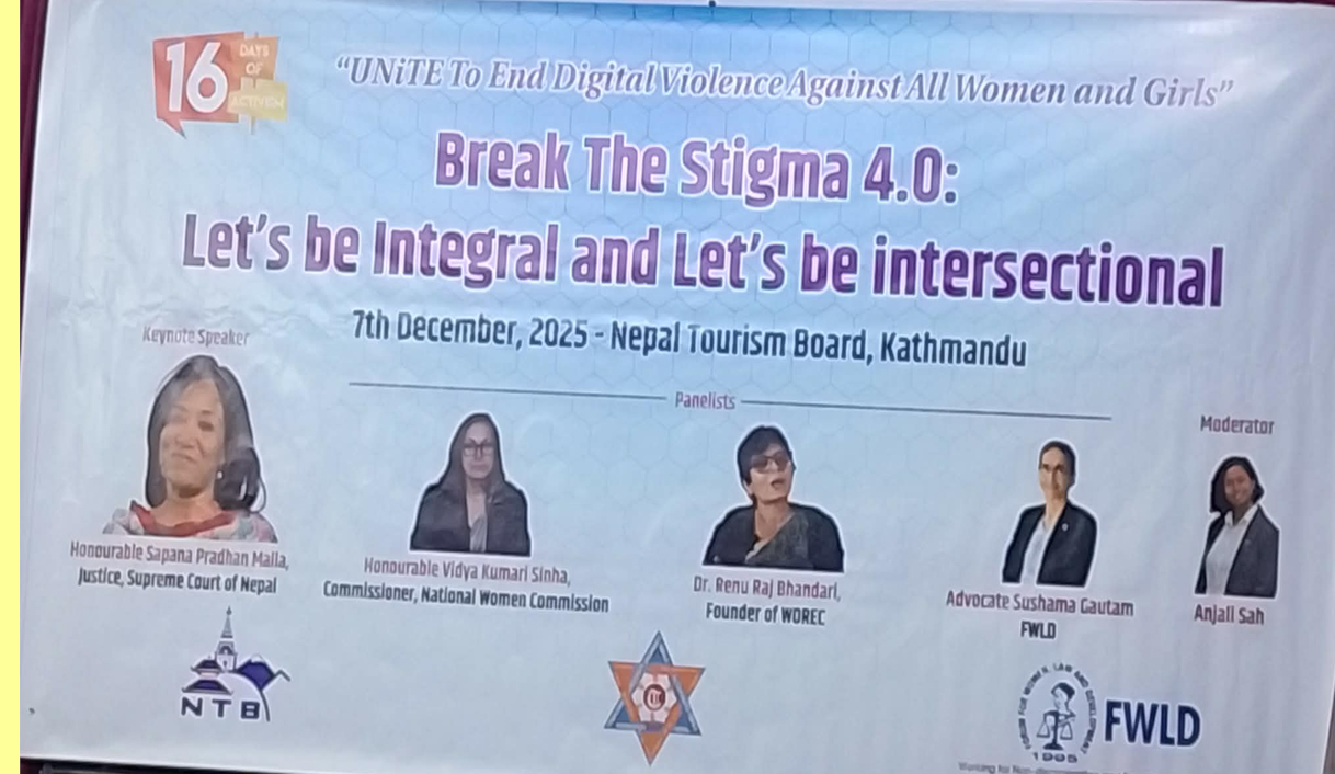 डिजिटल वातावरणमा महिला तथा केटीहरू विरुद्ध बढ्दो हिंसा रोक्न र अधिकार-संरक्षणका विषयमा बहसलाई सशक्त बनाउने उद्देश्यले ‘सबै महिला र केटीहरू विरुद्ध डिजिटल हिंसा अन्त्य गर्न एकजुट हुनुहोस्’ शीर्षकमा विशेष कार्यक्रम भएको छ । ‘कलंक तोड्नुहोस् ४.०ः अभिन्न बनौं र अन्तरसम्बन्धित बनौं’ नारासहित आयोजित यो कार्यक्रम १६ दिने लैंगिक हिंसा विरोधी अभियानअन्तर्गत गरेको छ ।