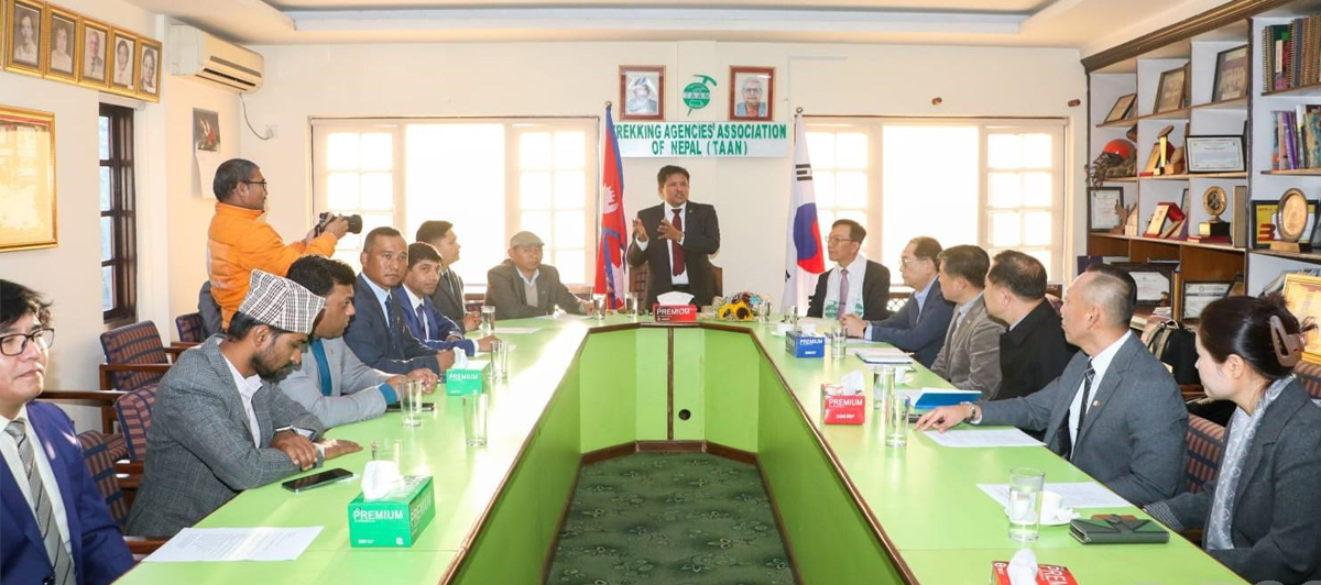 काठमाडौं- नेपालमा कोरियाली पर्यटन प्रवर्द्धन गर्ने उद्देश्यले ट्रेकिङ एजेसिस् एसोसिएसन अफ नेपाल (टान) र कोरिया एसोसिएसन अफ ट्राभल एजेन्ट्स (काटा)बीच समझदारीपत्रमा हस्ताक्षर भएको छ । नेपालका लागि कोरियाली राजदूत पार्क ते–यङको उपस्थितिमा टानका अध्यक्ष सागर पाण्डे र महासचिव सोनाम ग्याल्जेन शेर्पा तथा काटाका उपाध्यक्ष किम वियोम्जे र महासचिव वे योङ याङले सो समझदारीपत्रमा हस्ताक्षर गरेका हुन् ।