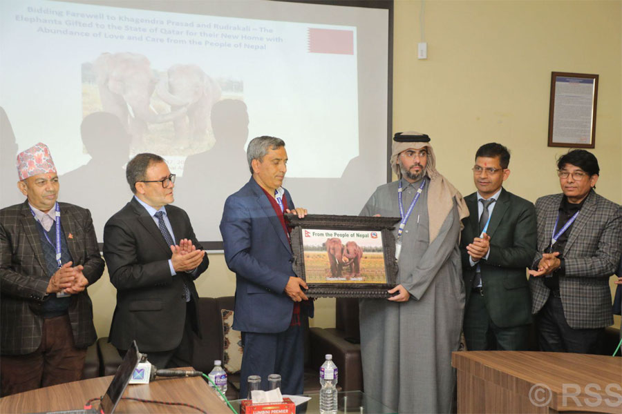 कतार एयरवेजको उडान नम्बर क्यू आर ८८२४ अन्तर्गतको बोइङ ७७७ एफ फ्रेटर कार्गो जहाजबाट बुधबार दिउँसो ५ बजे खगेन्द्रप्रसाद र रुद्रकली नामका दुई हात्ती भैरहवास्थित गौतमबुद्ध अन्तरराष्ट्रिय विमानस्थलबाट पठाइएको हो । यसअघि विसं २०८१ वैशाख ११ र १२ गते कतारका अमिर शेख तमिम बिन हमाद अल थानीको नेपाल भ्रमणका क्रममा नेपाल सरकारले एक जोडी हात्ती कतारलाई उपहार दिने निर्णय गरे अनुसार ती हात्ती पठाइएको हो ।