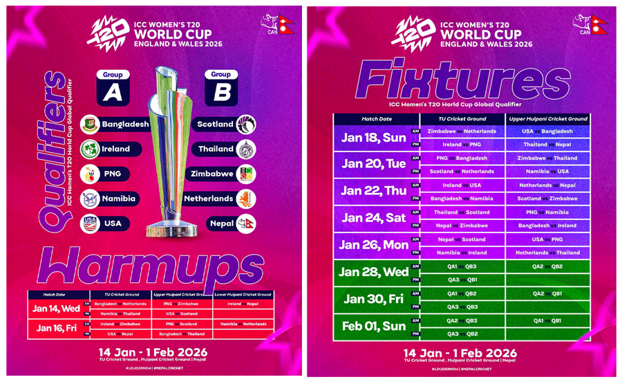नेपालले आफ्नो पहिलो खेलमा १८ जनवरीमा थाइल्यान्डसँग माथिल्लो मुलपनी क्रिकेट मैदानमा खेल्नेछ ।नेपालले पहिलोपटक विश्वकप एसिया छनोट पार गरेर ग्लोबल छनोटमा पुगेको थियो । यस प्रतियोगितामा दुवै समूहबाट शीर्ष ३ मा पर्ने टोलीहरू सुपर सिक्समा छनोट हुनेछन् । सुपर सिक्सबाट शीर्ष ४ टोलीहरू सन् २०२६ मा हुने महिला टी-२० विश्वकपमा छनोट हुनेछन् ।