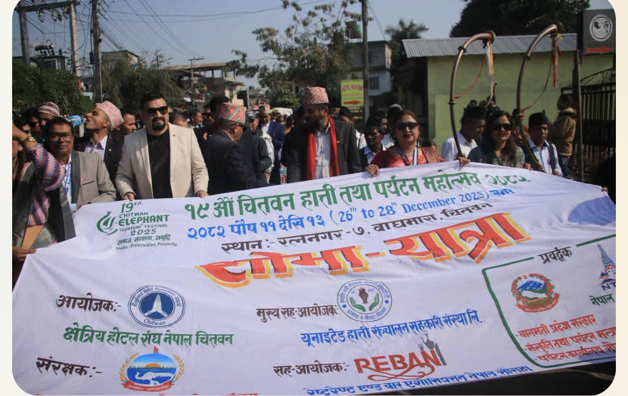 चितवन- चितवनको प्रमुख पर्यटकीय गन्तव्य सौराहामा आजदेखि १९औँ संस्करणको हात्ती तथा पर्यटन महोत्सव औपचारिक रूपमा सुरु भएको छ। सौराहास्थित बाघमारा मध्यवर्ती सामुदायिक वनको मैदानमा सुरु भएको महोत्सव आगामी पुस १३ गतेसम्म सञ्चालन हुनेछ। शुक्रबार आयोजित महोत्सवको उद्घाटन बागमती प्रदेशका मुख्यमन्त्री इन्द्रबहादुर बनियाँले गरेका हुन्। कार्यक्रममा पर्यटन, वन तथा वातावरण क्षेत्रका सरोकारवाला, स्थानीय व्यवसायी, पर्यटन उद्यमी, सञ्चारकर्मी तथा सर्वसाधारणको उल्लेखनीय उपस्थिति रहेको थियो।