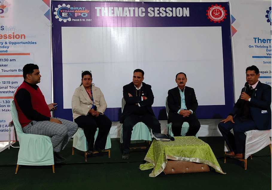 विराटनगर - विराट ट्रेड एक्स्पोमा हरेक दिन सञ्चालन हुँदै आएका थिमेटिक सेसनअन्तर्गत आइतबार पर्यटन उद्योग, अवसर र सम्भावनाबारे विस्तृत छलफल भएको छ । फस्टाउँदै गएको पर्यटन क्षेत्रलाई कसरी दिगो र प्रभावकारी बनाउने भन्ने विषयमा सरोकारवालाबीच विमर्श भएको हो ।