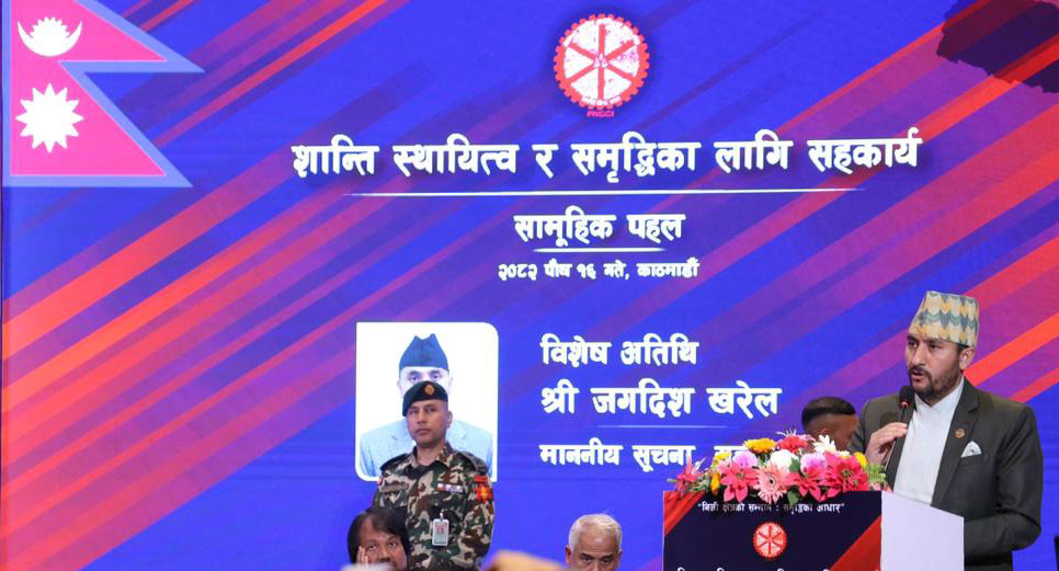 बुधबार काठमाडौंमा नेपाल उद्योग वाणिज्य महासंघले आयोजना गरेकाे ‘निजी क्षेत्रको सम्मान : समृद्धिको आधार’ भन्ने नाराका साथ गरेको शान्ति स्थायित्व र समृद्धिका लागि सहार्य समूहिक पहल भन्ने विषयमा छलफलमा उनले यस्ताे बताएका हुन् ।