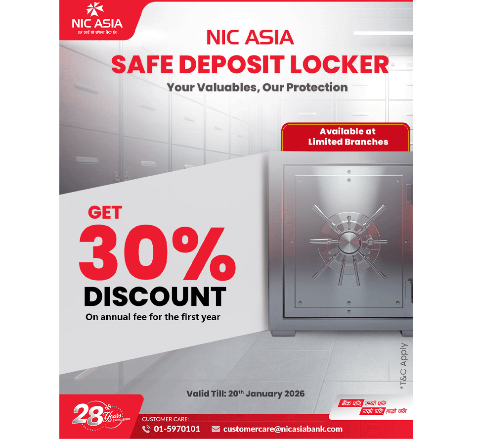 काठमाडाैं- एन आई सी एशिया बैंकको लकर सेवामा ग्राहकहरुका लागि ३० प्रतिशत छुट सुविधा उपलब्ध गर्ने भएकाे छ । एन आई सी एशिया बैंकले आफ्ना ग्राहकहरुको बहुमूल्य सामान तथा महत्वपूर्ण कागजातहरु ढुक्कका साथ सुरक्षित राख्ने चाहनालाई पूरा गर्न लकर सेवामा उपलब्ध गराएको विशेष छुट सुविधा बढाएर ३० प्रतिशत पुर्याएको छ ।