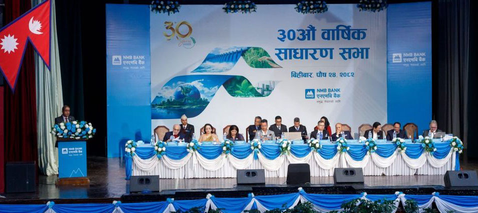 काठमाडौं- एनएमबि बैंकको ३०औं वार्षिक साधारण सभा सम्पन्न भएकाे छ । एनएमबि बैंकका संचालक समितिका अध्यक्ष, सञ्चालक र शेयरधनीहरुको उपस्थितिमा बिहीबार त्रिभुवन आर्मि अफिसर्स क्लब, टुँडिखेल, काठमाडाैंमा ३०औँ वार्षिक साधारण सभा सम्पन्न भएको हाे ।