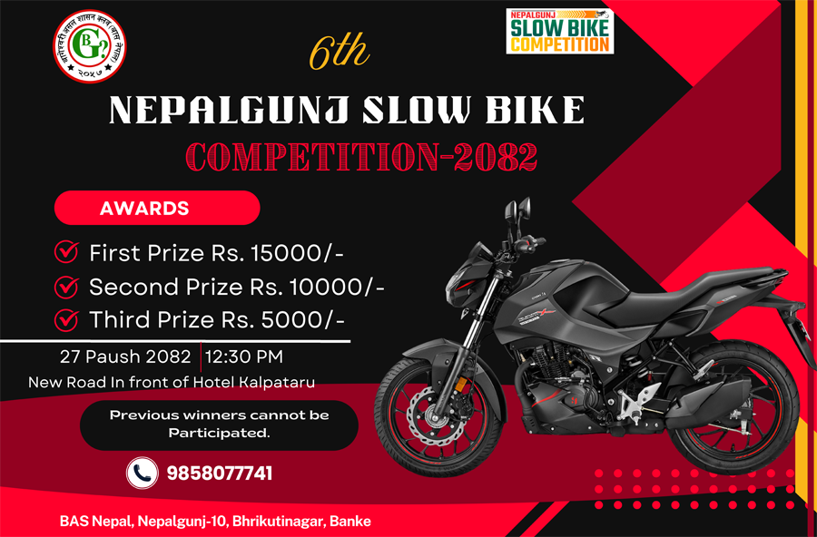 ट्राफिक प्रहरी कार्यालयको सहकार्यमा हुने उक्त प्रतियोगिता नेपालगन्जको न्यूरोडमा सञ्चालन हुनेछ । निर्धारित १०० मिटरको दुरी सबै भन्दा कम समय लगाएर अर्थात सुस्त गतिमा पार गर्ने प्रतियोगि बिजयि हुनेछन् । प्रथम, द्धितिय र तृतिय स्थान हासिल गर्ने प्रतियोगिले क्रमशः १५ हजार, १० हजार र ५ हजार सहित प्रमाण पत्र प्राप्त गर्नेछन् ।