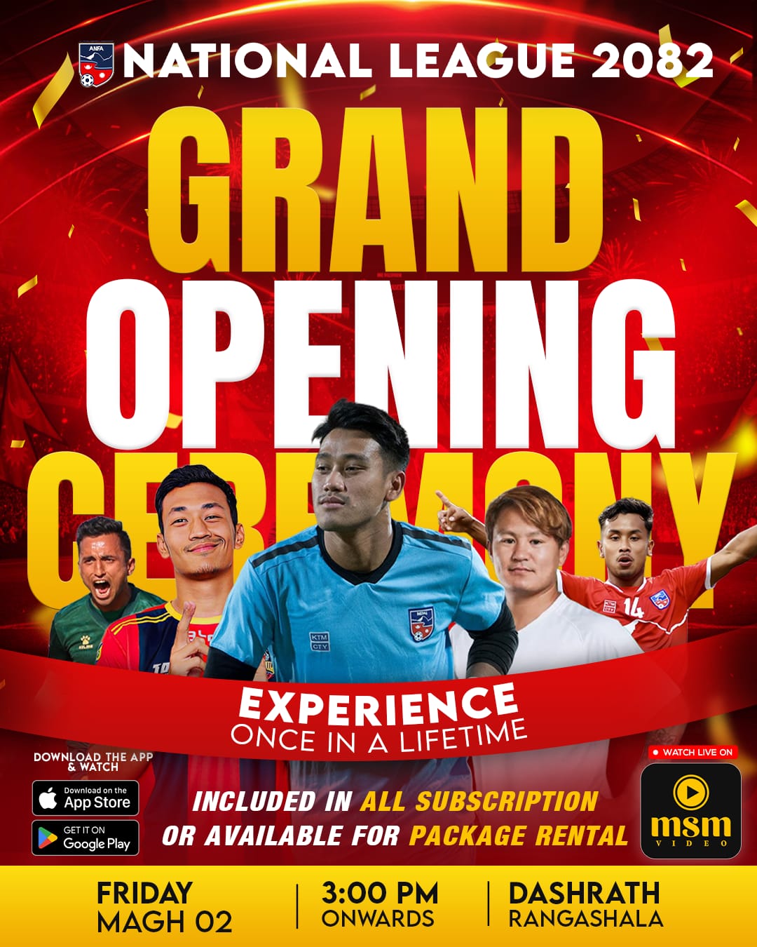 सज्जनराज वैद्यको भव्य सांगीतिक प्रस्तुति सङै नेसनल लिग २०८२ को ग्रान्ड ओपनिङ हुने छ । वैद्य युवामाझ निकै लोकप्रिय गायक हुन् । एन्फाले ४८ खेलसम्मको मिति र खेलस्थलसमेत तोकेको छ भने ६४ खेलसम्मको मिति पनि तय गरेको छ । बाँकी ७२ खेलको मिति तय हुन बाँकी छ ।राष्ट्रिय लिगका खेलहरु उपत्यकाको तीन मैदान दशरथ रंगशाला, च्यासल रंगशाला र एन्फा कम्प्लेक्समा हुनेछ । राष्ट्रिय लिगको विजेताले नगद ५० लाख पुरस्कार पाउने एन्फाले यसअघि नै सार्वजनिक गरिसकेको छ ।