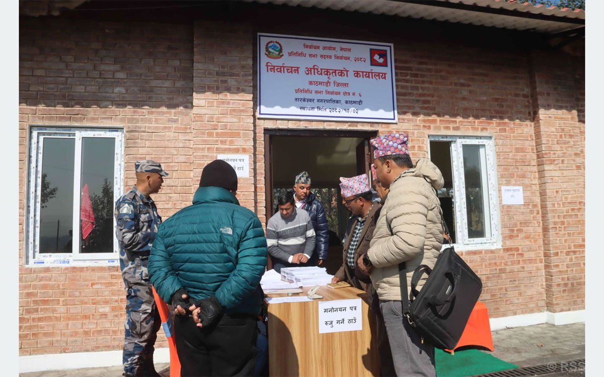 काठमाडौँ क्षेत्र नं १ मा सहकारी प्रशिक्षण केन्द्र नयाँ बानेश्वर, क्षेत्र नं २ मा कागेश्वरी मनोहरा नगरपालिका भवन, क्षेत्र नं ३ को गोकर्णेश्वर नगरपालिकको वडा नं ४ को कार्यालय, क्षेत्र नं ४ को बूढानीलकण्ठ नगरपालिकाको ज्येष्ठ नागरिक समाज भवन चपलीमा मनोनय दर्ता भइरहेको छ । काठमाडौँ क्षेत्र नं ५ का लागि टोखा नगरपालिकाको श्री समाज भवन, क्षेत्र नं ६ को तारकेश्वर नगरपालिकाको भवन धर्मस्थली, काठमाडौँ क्षेत्र नं ७ का लागि बहुउद्देश्यीय मार्सल आर्टस केन्द्र जुडोहल खुसिबु बालाजु, क्षेत्र नं ८ को नार्गाजुन नगरपालिकाको नगरपालिका भवन, क्षेत्र नं ९ को चन्द्रागिरि नगरपालिकाको भवन र क्षेत्र नं १० का लागि कीर्तिपुर नगरपालिकाको वडा नं २ को भवन बाघभैरवमा निर्वाचन अधिकृतका कार्यालय स्थापना गरिएको छ ।