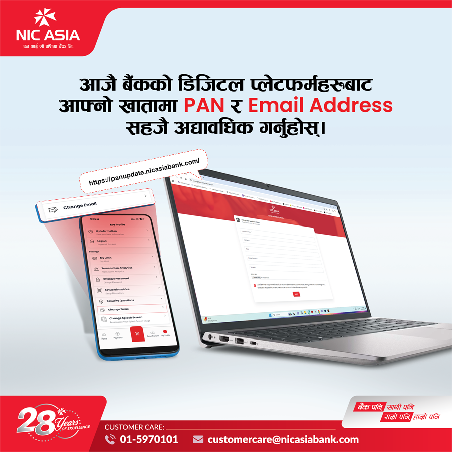 काठमाडाैं - एन आई सी एशिया बैंकले स्थायी लेखा नम्बर (PAN) र ईमेल ठेगाना अद्यावधिक गर्न अनुरोध गरेको छ। बैंकले आफ्ना ग्राहकहरूलाई करकट्टी विवरणमा समावेश गर्न खातामा स्थायी लेखा नम्बर (PAN) र ईमेल ठेगाना अद्यावधिक गर्न अनुरोध गरेको हाे।