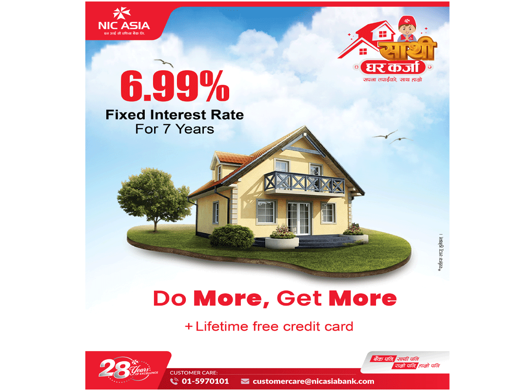 काठमाडाैं - एन आई सी एशिया बैंकद्वारा ६.९९ प्रतिशत स्थिर ब्याजदरमा रू. १० करोडसम्मको ‘एन आई सी एशिया साथी घर कर्जा’ योजना सार्वजनिक गरेकाे छ । एन आई सी एशिया बैंकले ग्राहक महानुभावहरूको आवश्यकतालाई हरसम्भव पूरा गर्नका लागि रू. १० करोडसम्म घर कर्जा प्रदान गर्ने उद्देश्यअनुरुप ‘एन आई सी एशिया साथी घर कर्जा’ योजना सार्वजनिक गरेको हाे ।