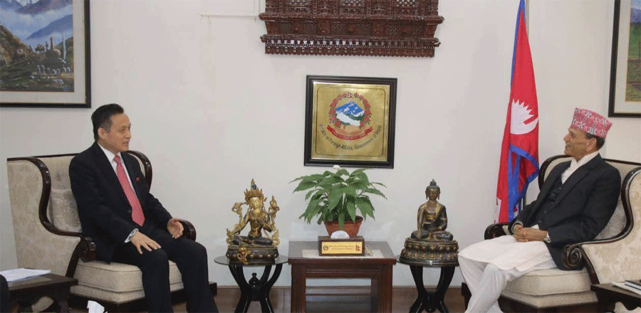 काठमाडौं - परराष्ट्रमन्त्री बालानन्द शर्मासँग नेपालका लागि चीनका राजदूत चाङ माओमिङले आज शिष्टाचार भेट गरेका छन् ।