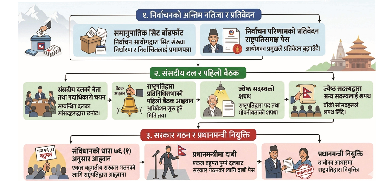 सहायक प्रवक्ता जिसीले प्रतिवेदन बुझाउने काम चैतको पहिलो सातातिर हुने बताए । उनले भने, ‘ढिलोमा चैतको पहिलो सातामा राष्ट्रपतिज्यूलाई प्रतिवेदन बुझाइसक्छौं ।’ आयोगले प्रतिवेदन बुझाएपछि दलहरूले संसदीय दलको नेता, उपनेता, प्रमुख सचतेक, सचेतक आदि पदाधिकारी चुन्ने गर्छन् । उता राष्ट्रपतिले प्रतिनिधिसभा बैठक आह्वान गर्छन् । सुरुमा प्रतिनिधिसभाका ज्येष्ठ सदस्यलाई पद तथा गोपनीयताको शपथ ग्रहण गराइन्छ । उनले नै अन्य प्रतिनिधिसभा सदस्यहरूलाई पद तथा गोपनीयताको शपथ ग्रहण गराउने प्रचलन छ । यस्तोमा राष्ट्रपतिले संविधानको धारा ७६ को उपधारा (१) अनुसार सरकार गठनको आह्वान गर्छन् ।