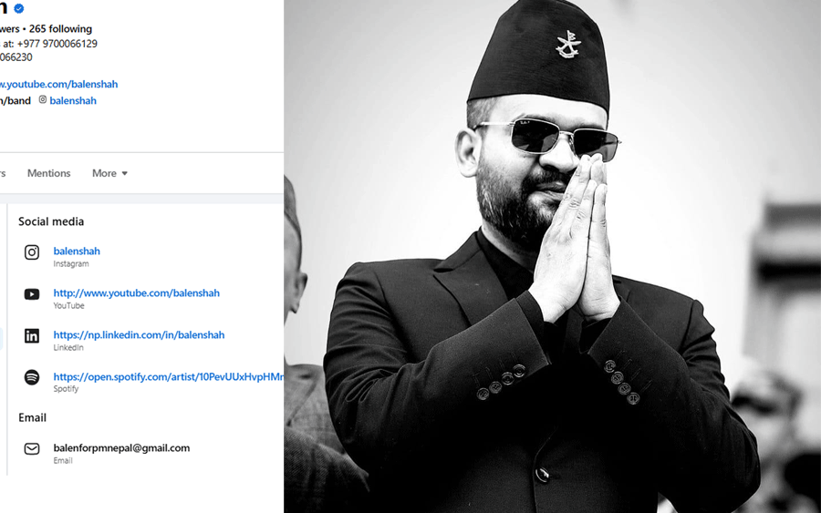 बालेनको भेरिफाइड पेजमा ‘[email protected]’ ईमेल ठेगाना देखिएको छ । ३८ लाख फलोअर रहेको फेसबुक पेजको ‘about’ मा क्लिक गरेर ‘Contact and basic info’ मा उक्त ईमेल ठेगाना देख्न सकिन्छ ।