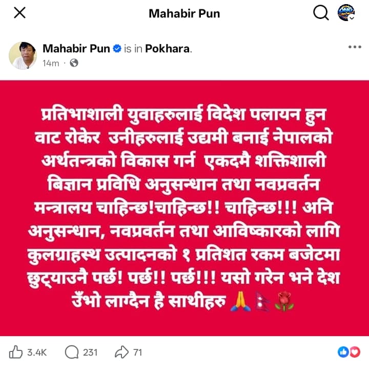 आगामी बजेटतर्फ संकेत गर्दै सांसद पुनले अनुसन्धान तथा आविष्कारका लागि GDP को १ प्रतिशत रकम छुट्याउनै पर्ने बताए। सामाजिक सञ्जालमा उनले लेखेका छन् , “अनुसन्धान, नवप्रवर्तन तथा आविष्कारको लागि कुल गार्हस्थ उत्पादनको १ प्रतिशत रकम बजेटमा छुट्याउनै पर्छ, नत्र देश अघि बढ्दैन।”
