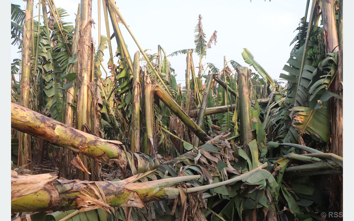 रत्ननगर नगरपालिका–११ निवासी कृषक बाबुराम भट्टले लगाएको छ बिघा केरामा क्षति पुगेको छ । जग्गा भाडामा लिएर केराखेती गर्दै आएका भट्ट चैत सुरु भएसँगै हुरीका कारण क्षति बेहोर्नु परेको बताए । आफूले लगाएको केरा उत्पादन लिने समयमा हुरीले ढलाए पछि अहिले केरा बगान सरसफाइका लागि मजदुर लगाएर काम गर्नुपर्ने अवस्थामा पुगेको उनको भनाइ छ । उनले लगाएको केरा अधिकांश ढलेको अवस्थामा पुगेको छ ।प्रतिहेक्टर मालभोग २४ टन र जी नाइन ५५ टन उत्पादन हुँदै आएको कार्यालयको तथ्यांकमा उल्लेख छ । जिल्लामा व्यावसायिक रुपमा ७०० किसानले केराखेती गर्दै आएका छन् ।