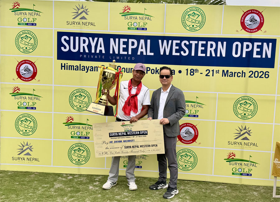 पोखरा - सूर्य नेपाल गल्फ टुर २०२५-२६ अन्तर्गत पाँचौं प्रतियोगिता तथा २६ औँ संस्करणको सूर्य नेपाल वेस्टर्न ओपनको उपाधि भुवन नगरकोटीले जितेका छन्। आज इभन-पार ६९ खेलेका उनले समग्रमा ३-अन्डर २ सय ४ को स्कोरमा सञ्जय लामालाई एक स्ट्रोकले हराउँदै उपाधिमा ह्याट्रिक गर्न सफल रहे।
