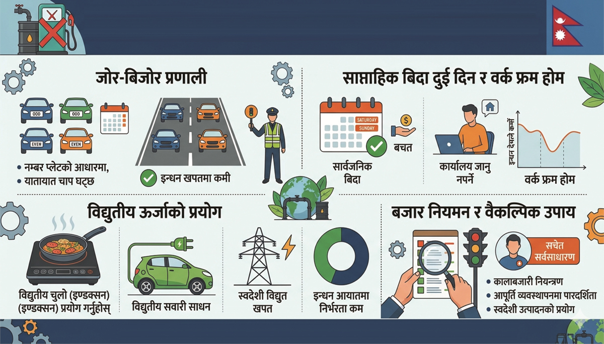 मन्त्रालयका प्रवक्ता नेत्रप्रसाद सुवेदीका अनुसार सवारीसाधनमा जोरबिजोर प्रणाली लागू गर्ने, साप्ताहिक बिदा दुई दिन पु¥याउने तथा ‘वर्क फ्रम होम’ जस्ता विकल्पहरूमा छलफल भइरहेको हो । उनले प्रभावसँग भने, ‘यो सवारीसाधनको चाप घटाएर इन्धन खपत कम गर्ने एउटा उपाय हुन सक्छ । यसबारे प्रारम्भिक छलफलमा छौं ।’