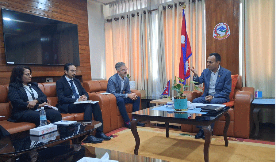 काठमाडौं - सञ्चार तथा सूचना प्रविधिमन्त्री डा. विक्रम तिमिल्सिनासँग नेपालका लागि विश्व बैंकका देशीय निर्देशक डेभिड सिस्लेन नेतृत्वको प्रतिनिधिमण्डलले उहाँको कार्यकक्षमा शिष्टाचार भेट गरेको छ ।