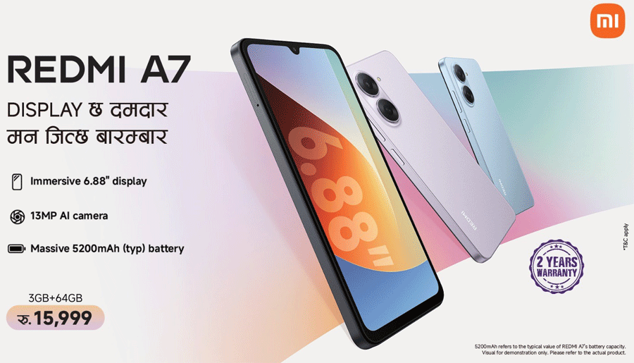 काठमाडौं - विश्वको अग्रणी प्रविधि ब्रान्ड साओमीले आधिकारिक रुपमा नयाँ इन्ट्री-लेभल स्मार्टफोन रेड्मी ए-सेबेन सार्वजनिक गरेको छ । उत्कृष्ट र परिस्कृत डिजाइन, ठूलो डिस्प्ले स्क्रिन र उच्चस्तरीय कार्यक्षमताका साथ यो स्मार्टफोन नेपाली बजारमा आएको हो ।